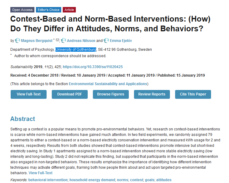 #SUSEditorialChoice Contest-Based and Norm-Based Interventions: (How) Do They Differ in #Attitudes, #Norms, and Behaviors? by Magnus Bergquist, Andreas Nilsson and Emma Ejelöv from @goteborgsuni https://www.mdpi.com/2071-1050/11/2/425 … #BehavioralIntervention #householdenergydemandpic.twitter.com/tVFfZypw63