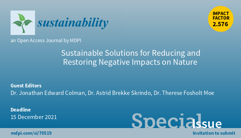 #Sustainability Special Issue "Sustainable Solutions for Reducing and Restoring Negative Impacts on Nature" welcomes submissions Lead Guest Editor: Dr. Jonathan Edward Colman #mitigation #ecosystem #restoration More at: https://bit.ly/3sBpGW3 pic.twitter.com/LmfXXmAA1G