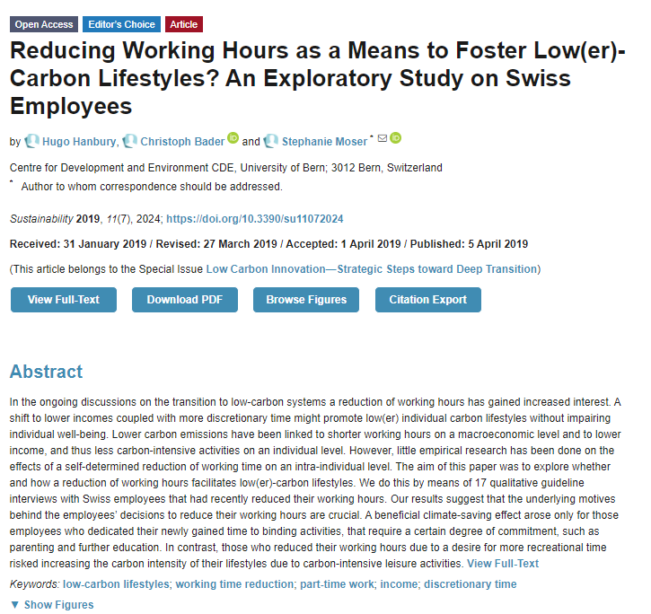 #SUSEditorialChoice #Reducing Working Hours as a Means to Foster Low(er)-Carbon Lifestyles? An Exploratory Study on Swiss Employees by Hugo Hanbury, Christoph Bader, Stephanie Moser https://www.mdpi.com/2071-1050/11/7/2024 … #CarbonZero #lifestyle #workingtogether #workingfromhomepic.twitter.com/WD4Jx5c066