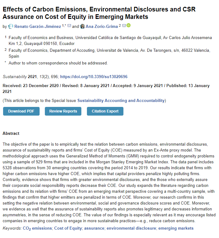 #SUSInterestingPaper Effects of Carbon Emissions, Environmental Disclosures and CSR Assurance on Cost of Equity in Emerging Markets by R. G. Jiménez & A. Z. Grima #emissions #Sustainability Full text available at: https://bit.ly/3aDuNx6 pic.twitter.com/AO4jyvPCIh
