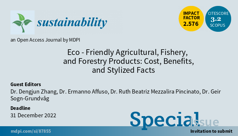 #SUSSpecialIssue "Eco-Friendly Agricultural, Fishery, and Forestry Products: Cost, Benefits, and Stylized Facts" welcomes the submission by Dr. Dengjun Zhang, et al. #sustainability #ecofriendly #SDG More at https://www.mdpi.com/journal/sustainability/special_issues/ecofriendly_agricultural_fishery_forestry_products …pic.twitter.com/bSoP061OzI