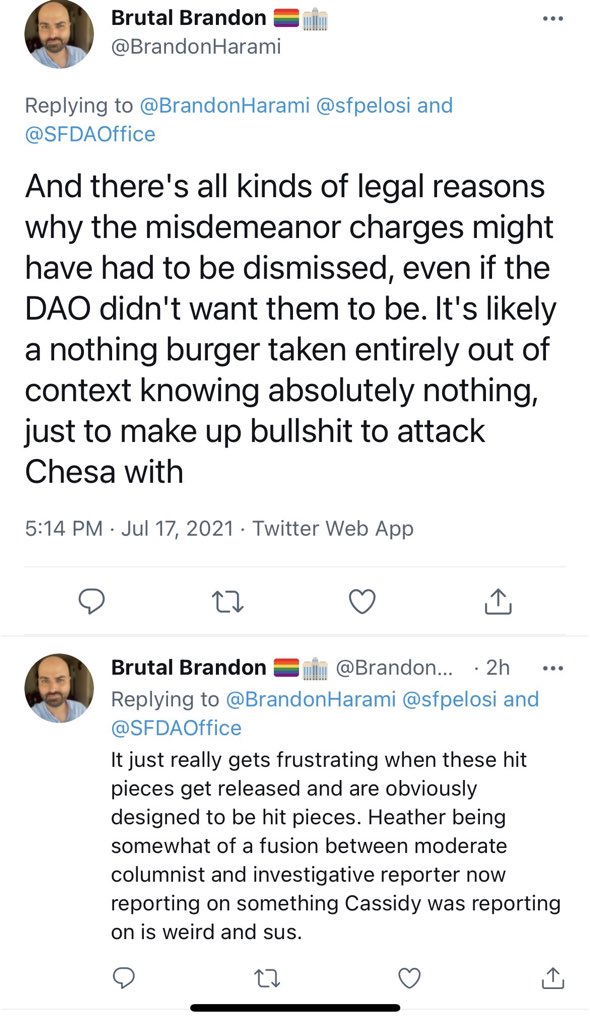 A nothing burger, @brandonharami? A little girl nearly raped is a nothing burger to you? Wow. Great appointee @DavidCamposSF. Company you keep @chesaboudin. You defend this guy @Scott_Wiener? Wow. https://twitter.com/MeanTweets4Ever/status/1418973908796166151 …pic.twitter.com/BBPP8lV0jN