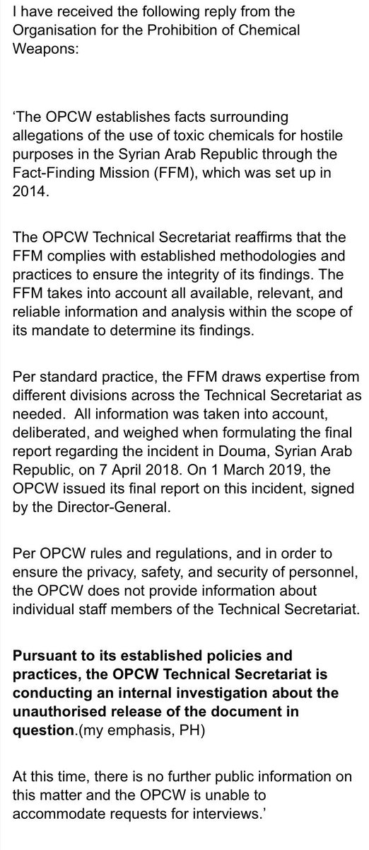 Ian Henderson, a disgruntled OPCW employee, sent his speculative assessment to the "Working Group". But when the working group tried to establish his credentials, the OPCW confirmed that he was NOT part of the Fact Finding Mission. Which means, he had no direct access.pic.twitter.com/ArT6y8gh11