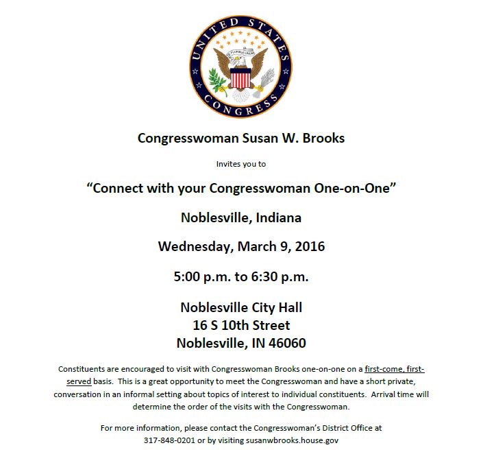 Next week I'll be in @NoblesvilleIN to connect with you! Come visit me at City Hall from 5-6:30 on 3/9. #IN05pic.twitter.com/PRfISy5cjD