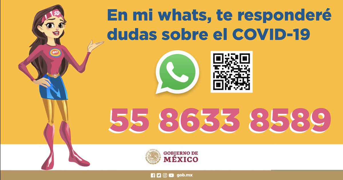 Escribe HOLA al 5586338589 o escanea el QR y te ayudaré a resolver tus dudas sobre el COVID-19.