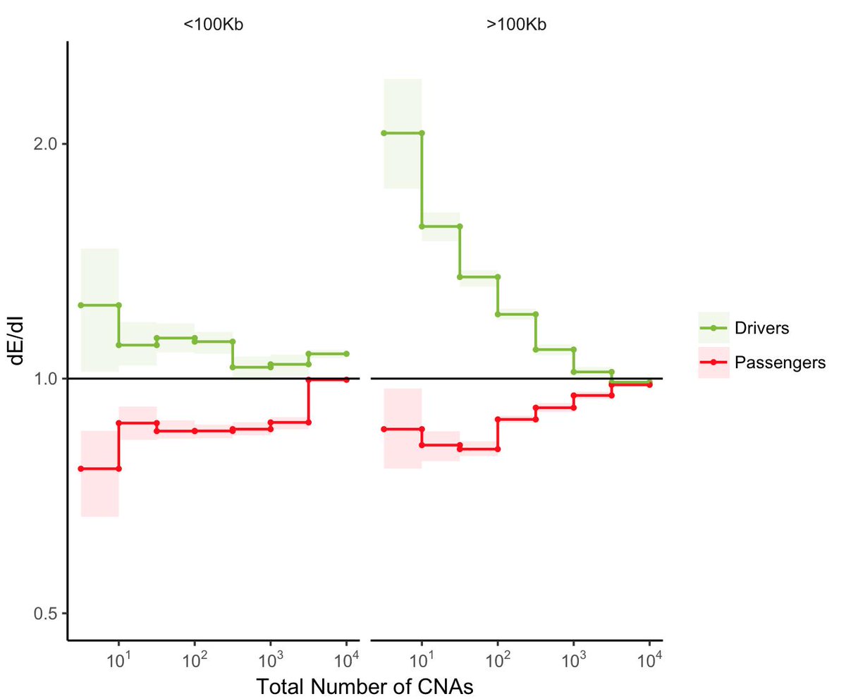 We see the same trend in somatic CNAs. Using a dN/dS-style statistic called dE/dI (fractional overlap of CNAs in [E]xonic versus [I]ntergenic/[I]ntronic regions) – we similarly see that selection on CNAs attenuates as the mutational burden increases. (6/10)pic.twitter.com/LUg6hlRJFk