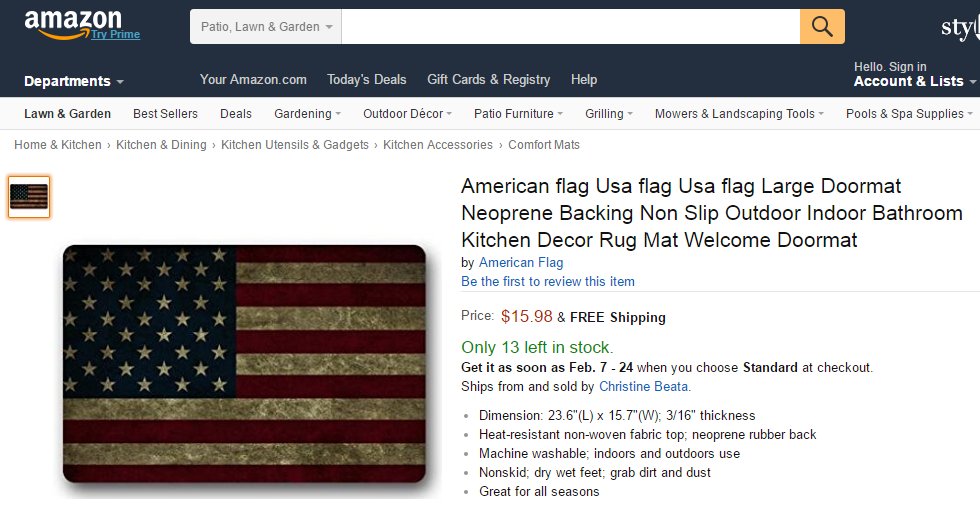 Looks like they listened to you, but are still selling USA flag doormats... in the USA... https://www.amazon.com/American-Doormat-Neoprene-Backing-Bathroom/dp/B015VYAFTA …pic.twitter.com/8UM2UNivJz