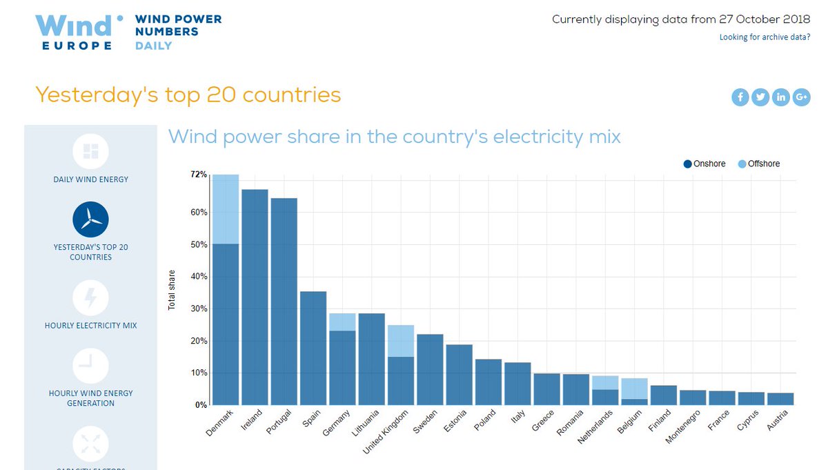 On Saturday, wind produced 17% of Europe's electricity! Denmark 72% Ireland 67% Portugal 65% Spain 35% Germany 29% Lithuania 29% UK 25% Sweden 22% https://windeurope.org/about-wind/daily-wind/ …pic.twitter.com/yA8Y6jUxmY