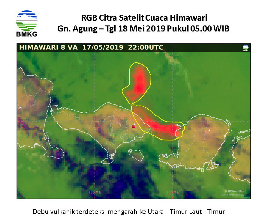 Gunung Agung kembali erupsi dengan tinggi kolom abu 2 km pada 18/5/2019 pukul 02:09 WITA. Kolom abu teramati berwarna kelabu dengan intensitas tebal condong ke arah timur dan tenggara. Erupsi terekam di seismogram dengan amplitudo maksimum 25 mm dan durasi ± 2 menit 57 detik.pic.twitter.com/ybOMbnuAvW