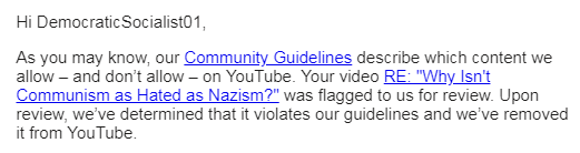 Probably because "Nazism" was in the title. I note that Prager's idiotic video is still up though as is Crowder's revisionist nonsense("Hitler was a socialist LIBERAL"). What a joke you tube has become.pic.twitter.com/KN6tYMYfci