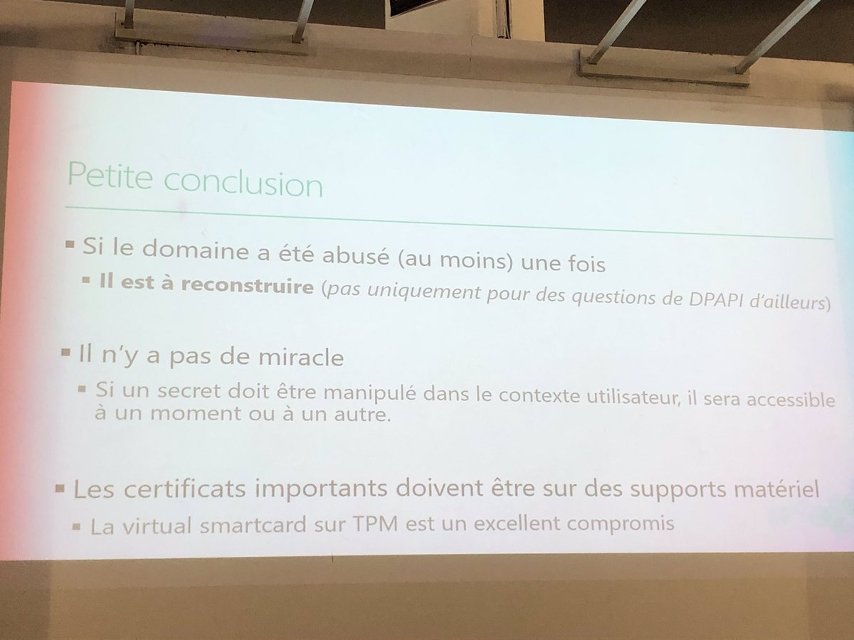 « vous êtes administrateur du domaine une fois vous récupérez ce secret inchangeable vous récupérez tous les mots de passe des utilisateurs » « compromis 1 fois toutes les forêts à refaire » #RTFM@sigsegv_event