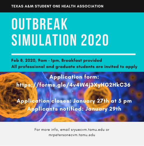 @TAMU are invited to apply *by 27 Jan 8am* for the SOHA Outbreak Simulation https://forms.gle/erwCmxhKyY2YdEET6 …@tamuvetmed@TAMU_SPH@TAMUHealth@tamuansc@wfsctamu@TAMUpharmacypic.twitter.com/xr3fF1ppNZ