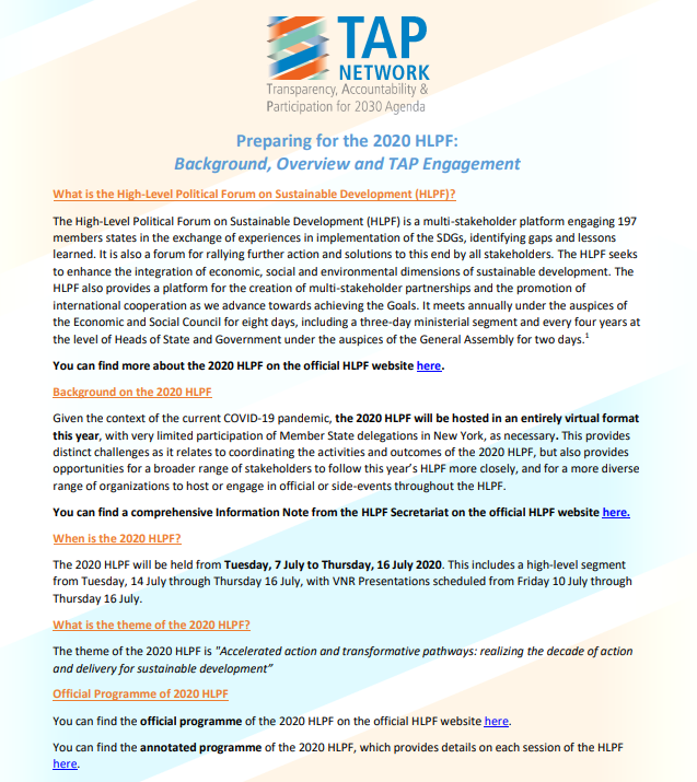 Have you read our #HLPF2020 Background Note? It includes important logistical info to navigate the virtual conference. Keep up with all of our virtual events and take advantage of these resources @ https://tapnetwork2030.org/2020hlpf/  #SDG16 #SDGAccountabilitypic.twitter.com/MKY46wBeyJ