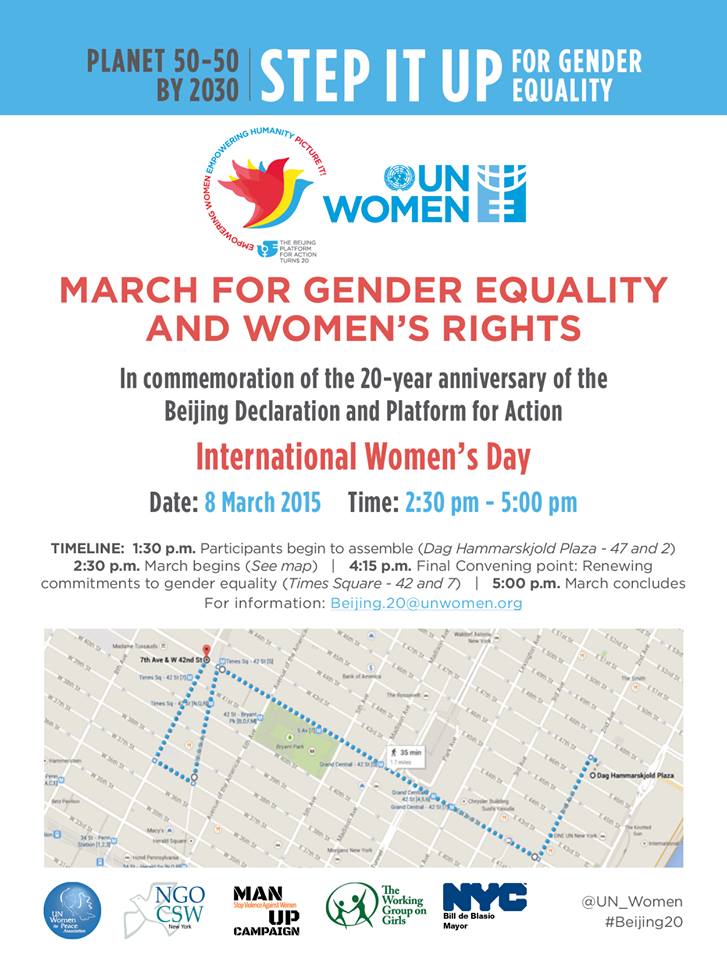 #Beijing20 March for Gender Equality and Women’s Rights on International Women’s Day, March 8, 2015 NYC 2:30-5:00PMpic.twitter.com/yY0F9ThAwD