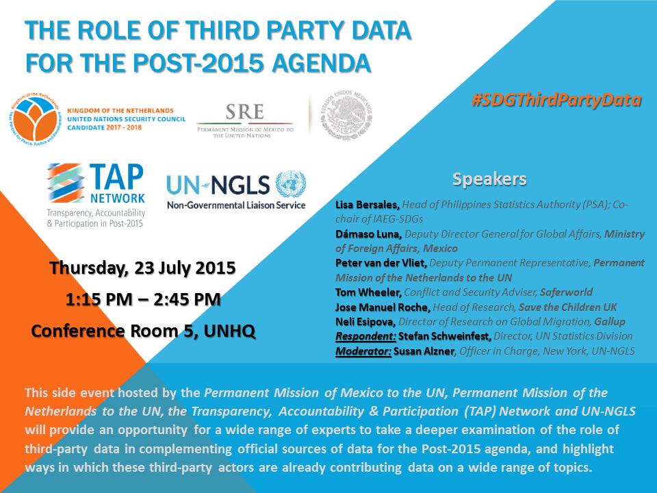 SAVE THE DATE 23 Jul 1:15 PM @UN CR5 @TAPNetwork2015 @unngls @NLatUN @MexOnu side-event #post2015 #SDGThirdPartyDatapic.twitter.com/f4OOQFm0Yp