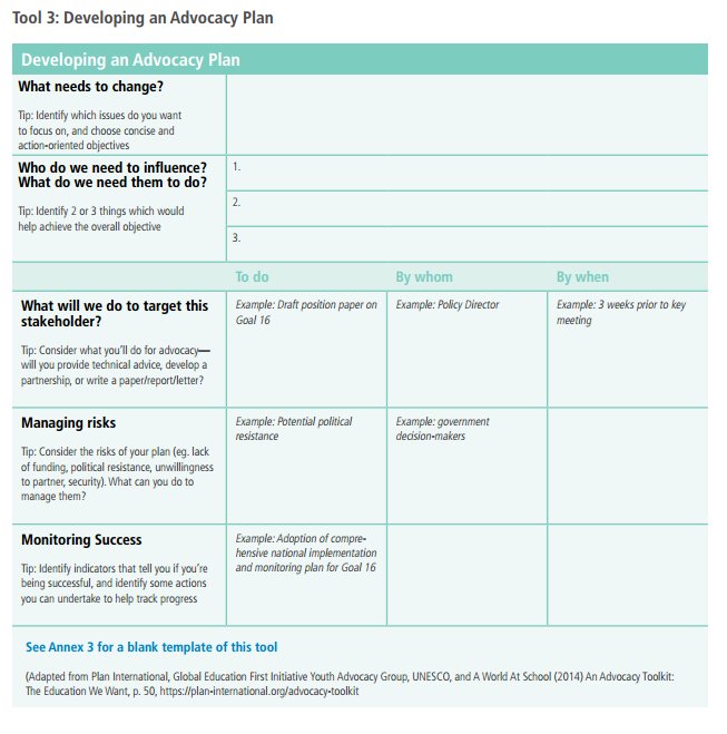 Want to Develop an Advocacy Plan for Implementation of #Goal16 at the National Level? http://ow.ly/h9Ly300O8Qv pic.twitter.com/F3FPjwoWbC