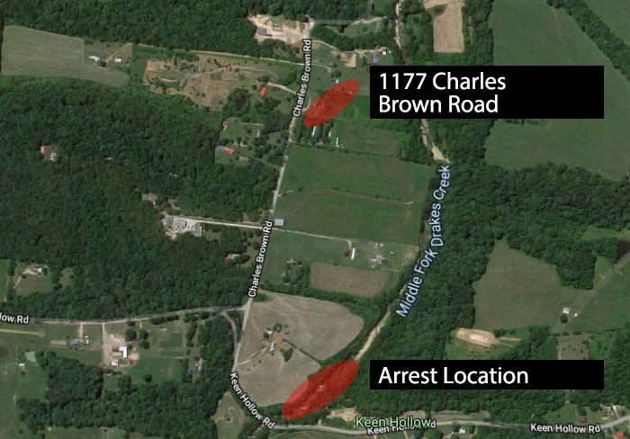 In response to several media inquiries today, here's a map showing the arrest location in relation to the Charles Brown Road scene. The arrest location is roughly half a mile away, as the crow flies.pic.twitter.com/mcXiAoX4lz