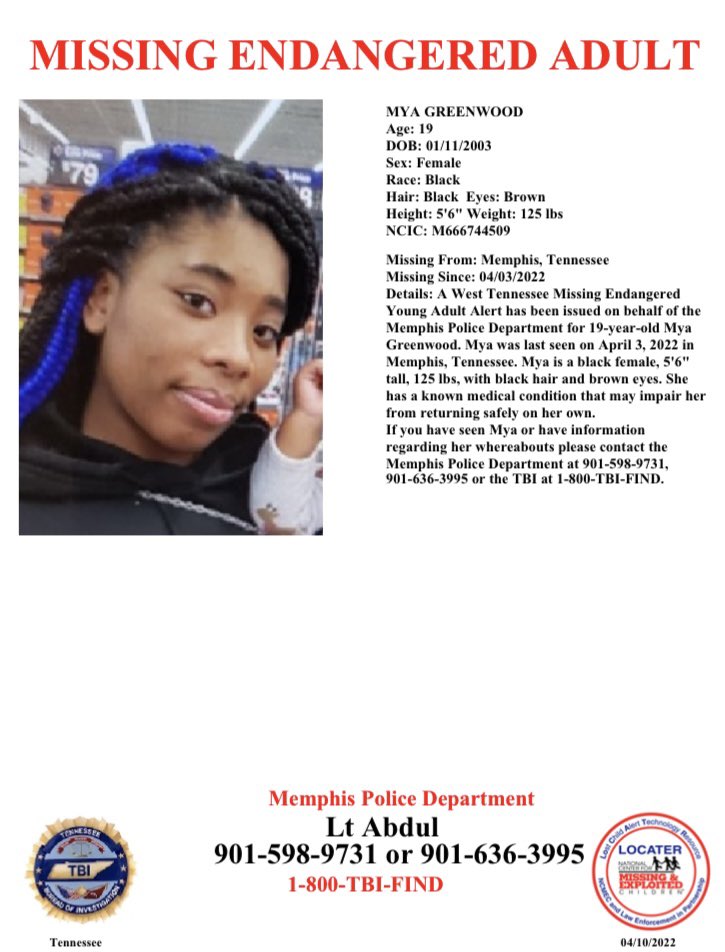 A Missing Endangered Young Adult Alert has been issued on behalf of the Memphis Police Dept for 19-y/o Mya Greenwood. Maya is 5’7”, weighs 125 pounds, with black hair and brown eyes. If you have any info about Mya, please call Memphis PD, 901-598-9731 or 901-636-3995.pic.twitter.com/k4lVhpsnOZ