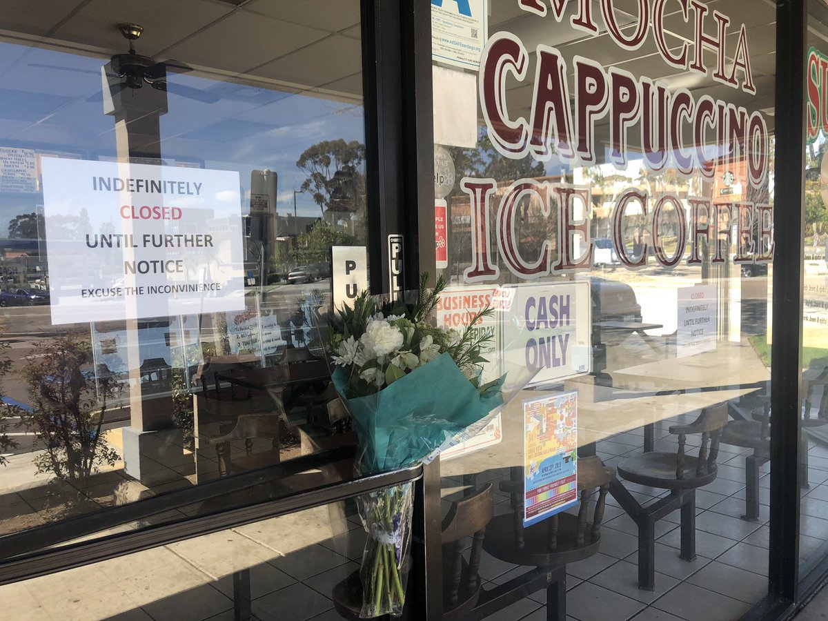 Flowers placed on the door of Rose Donuts after the owner of the store was placed in critical condition after a home invasion
