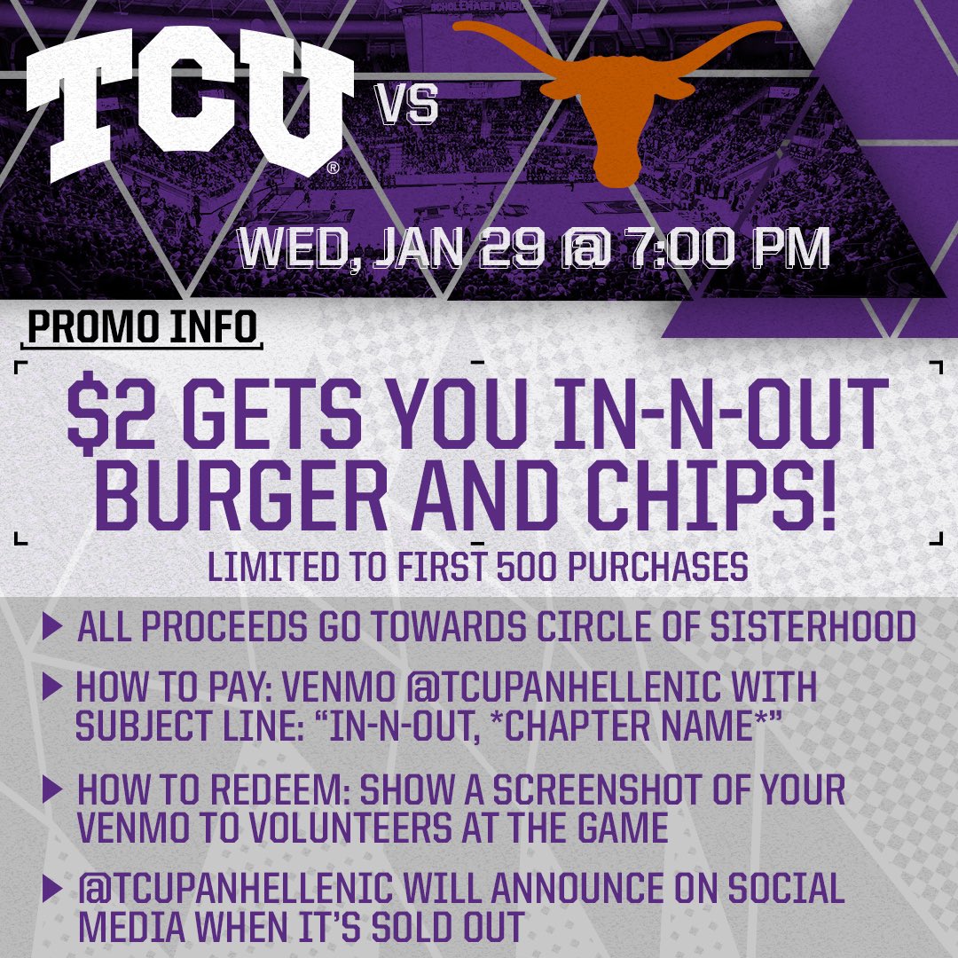 Come to the game on Wednesday where the Frogs take on Texas and make sure to purchase your in-n-out for only $2!pic.twitter.com/sO84YzBx7d