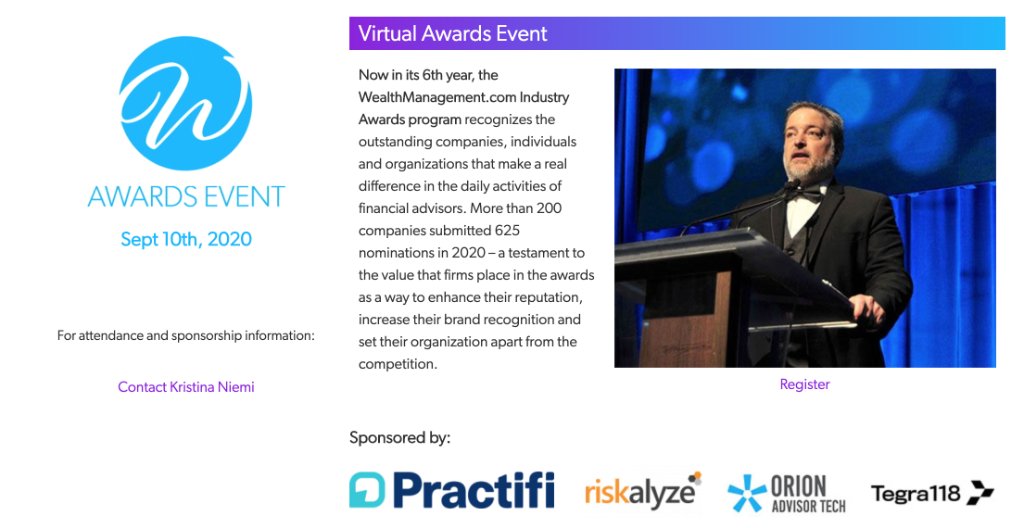 #Wealthies Awards broadcast live on 9/10! This fast-paced virtual event will be the industry’s most entertaining awards program of the year. How many best-in-breed companies are you working with? Tune it to find out. http://spr.ly/6018GqJAE#WMIA20pic.twitter.com/Fg8ovJn7Qx