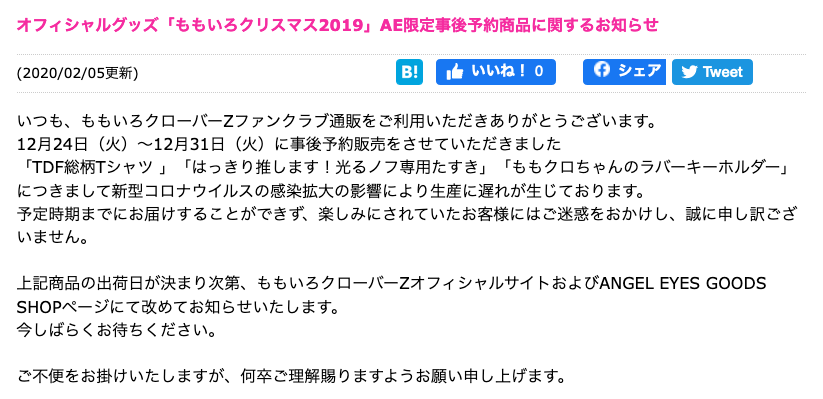 オフィシャルグッズ「ももいろクリスマス2019」AE限定事後予約商品に関するお知らせ http://www.momoclo.net/pub/pc/information/?id=5456 … 「TDF総柄Tシャツ 」「はっきり推します!光るノフ専用たすき」「ももクロちゃんのラバーキーホルダー」につきまして新型コロナウイルスの感染拡大の影響により生産に遅れが生じておりますpic.twitter.com/icAW0htMQr