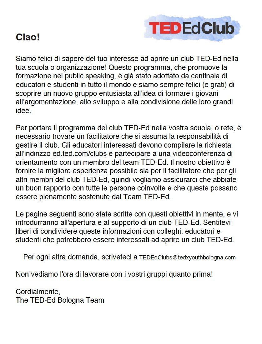 Diamo il benvenuto ai primi TED-Ed Club aperti a Bologna, Vicenza, Venezia, Parma, ReggioEmilia, Voghera e Pavia...pic.twitter.com/hTMfymJsps