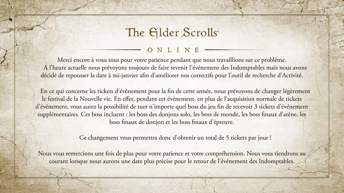Normalement, le festival de la nouvelle vie a lieu du 19/12 au 02/01. Source : https://www.elderscrollsonline.com/fr/slaydragonssavecats … (partie "événements en jeu")