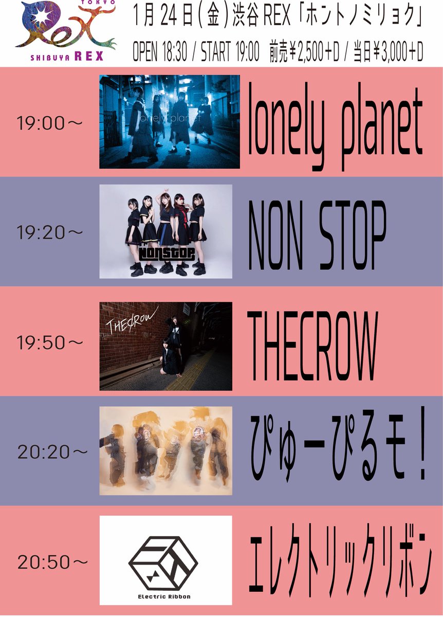 【タイムテーブル公開】 1月24日(金)渋谷REX 『ホントノミリョク』 開場18:30/開演19:00 前売¥2,500+1D 出演 ぴゅーぴるモ! THECROW lonely planet エレクトリックリボン NONSTOP ライブ19:50〜20:20 特典会21:20〜22:30 ご予約→ https://tiget.net/events/79687
