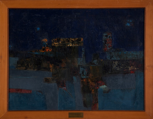Critically acclaimed for his nuanced portraits Baburao Sadwelkar chose to delve into impressionistic treatment of modern art renditions of landscapes, creating a patchwork of colour sensations as seen in ‘City at night’