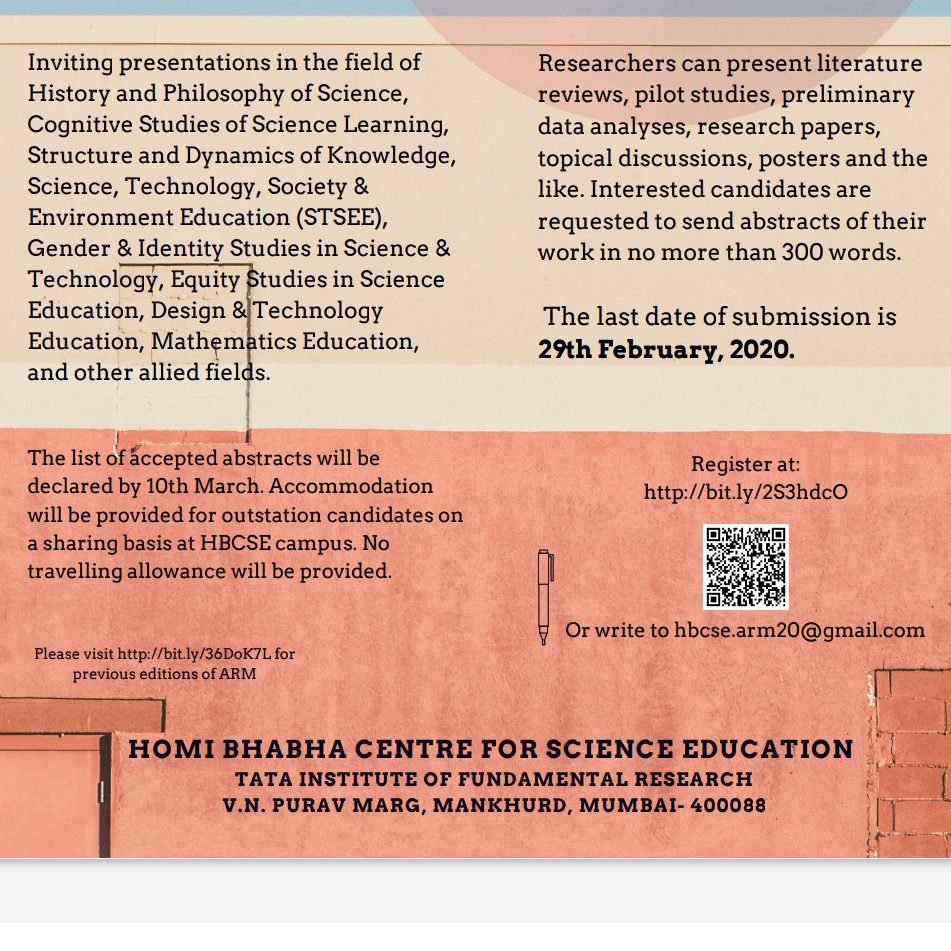 #HBCSE_ARM) April 1-3,2020 Interested participants can#Register at: https://tinyurl.com/HBCSE-ARM Participants can submit their abstracts of 300 words(max) in PDF/Word format only by 29 Feb 2020pic.twitter.com/r9o0KonxaN