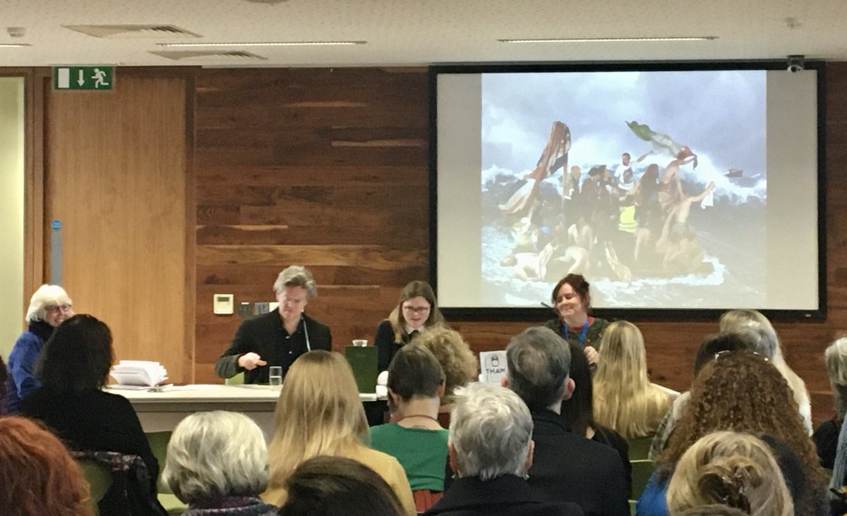 The new “Brexit” artwork, by artist Rita Duffy, 2019 and now hanging on the side of Trinity’s digital hub building, and based of course on the famous painting “The Raft of the Medusa” by Théodore Géricault (1819)