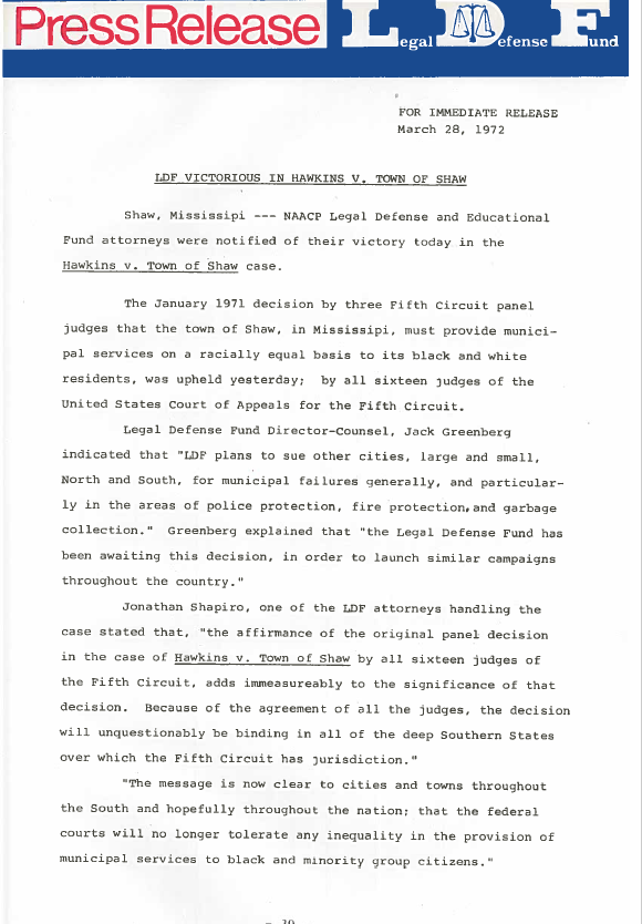 Last week, the town of Shaw, Mississippi celebrated the 50th anniversary of Hawkins v. Shaw. @NAACP_LDF filed a lawsuit on behalf of Andrew Hawkins and pioneered the effort to require cities to equalize municipal services.pic.twitter.com/uEYzZvlJsB
