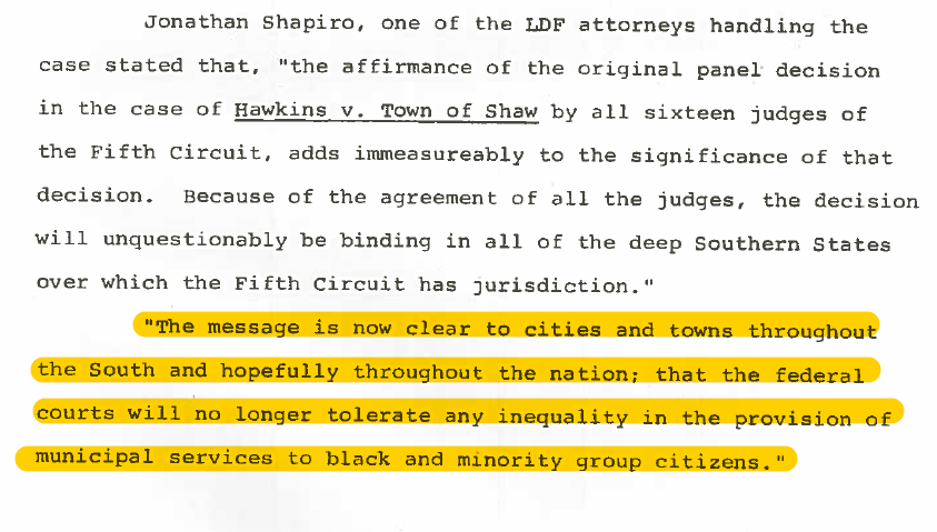 LDF attorney Jonathan Shapiro notes, “the message is now clear...the federal courts will no longer tolerate any inequality in the provision of municipal services to...minority citizens.”pic.twitter.com/RSTQ1gPR0r