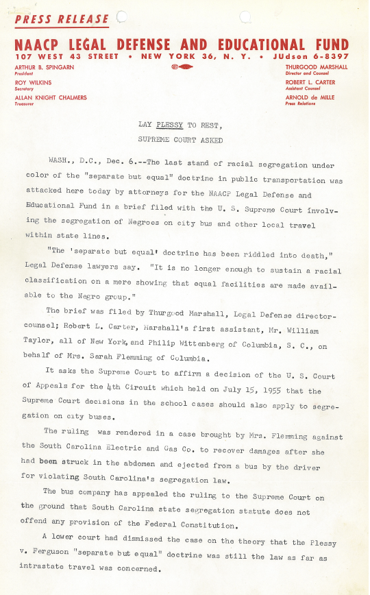 Just one month after #BrownvBoard was decided, Sarah Mae Flemming was violently forced off a city bus in South Carolina by the driver. In a press statement, LDF stated this case represented an opportunity to grant Plessy v. Ferguson a “final repose.” #BHMpic.twitter.com/UWe1u7l7Vk