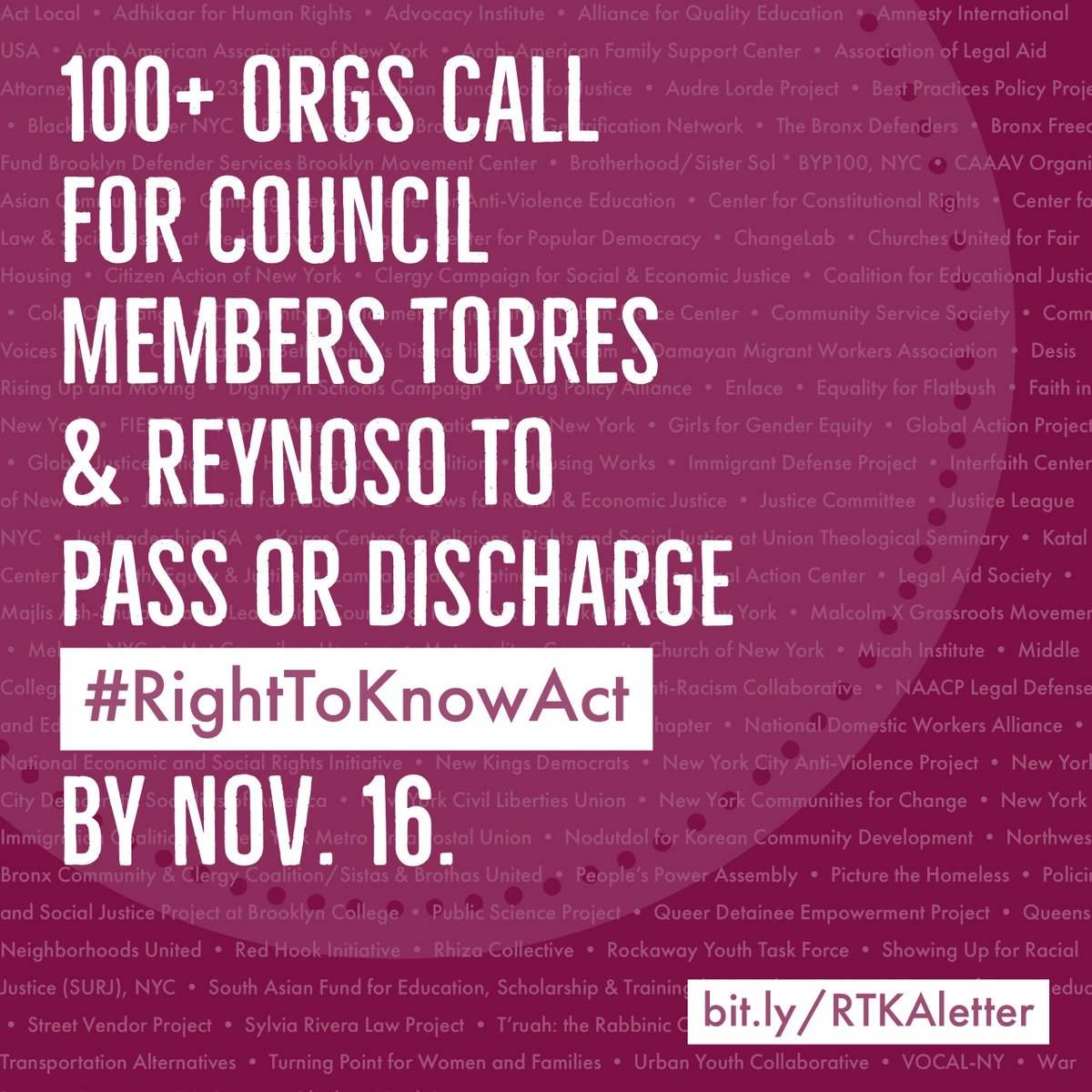 We're 1 of 100+ orgs calling on @RitchieTorres & @CMReynoso34 to pass or discharge #RighttoKnowAct by 11/16 meeting. http://bit.ly/RTKAletter pic.twitter.com/vUE0D1I1Xi