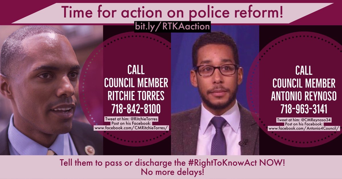 Alongside over 200 groups, the majority of @NYCCouncil members & many families of NYers killed by the NYPD, we support the #RightToKnowAct. Tell @CMReynoso34 and @RitchieTorres to pass the #RightToKnowAct NOW. http://bit.ly/RTKAaction pic.twitter.com/0HXmpOkQ2N