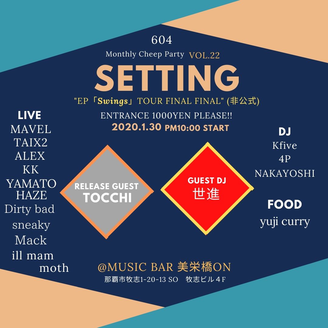 #今週】 01.30.Thu 〓604 Monthly Cheep Party “SETTING vol.22” - EP "Swings" TOUR FINAL FINAL-(非公式)〓@on_okinawa 那覇 START 22:00 ▪︎Release Guest TOCCHI ▪︎Guest DJ 世進 ▪︎Live MAVEL TAIX2 ALEX KK YAMATO HAZE Dirty bad sneaky Mack ill mammoth#沖縄pic.twitter.com/BhRcUnkk3T