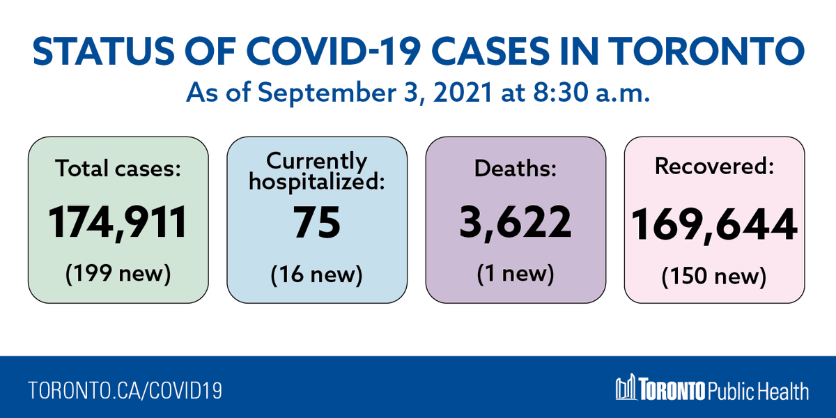 #COVID19 update: As of September 3 at 8:30 a.m., there have been 174,911 cases (199 new since September 2), 75 people are in hospital (16 new) & 3,622 deaths (1 new) & 169,644 recoveries (150 new).pic.twitter.com/R1jBlQXcXH