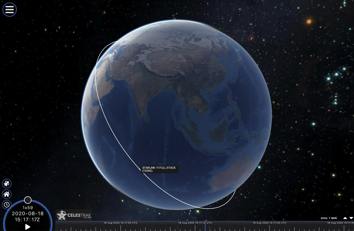 CelesTrak now has pre-launch SupTLEs for the 11th #Starlink launch, set for Aug 18 at 1431 UTC: https://celestrak.com/NORAD/elements/supplemental/ …. Deployment of 58 satellites is set for 2020-08-18 15:17:17.110 UTC. SupTLEs are derived from ephemerides provided by @SpaceX.pic.twitter.com/vYlhGWlixh