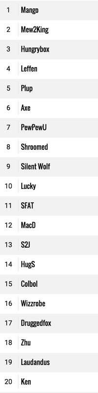 @TSM_Leffen This is the current top 20 seeds, don't believe they are finalized. @sheridactyls ?pic.twitter.com/FwGB7aASuz