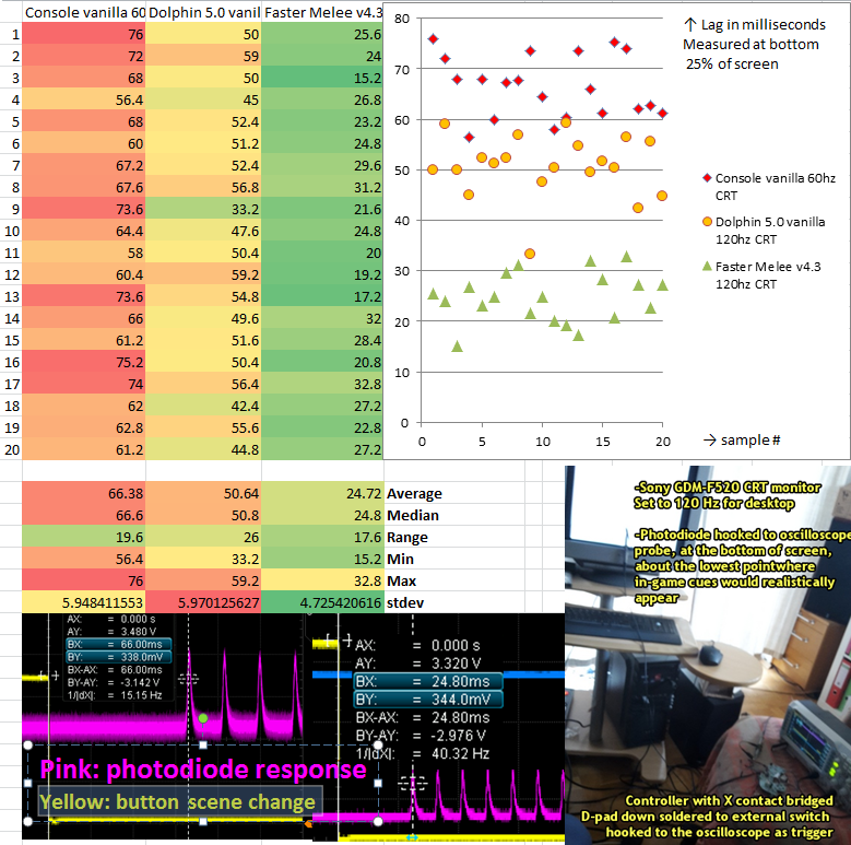 I re-did the lag testing of console vs Dolphin 5.0 vs Faster Melee, measured at the bottom of CRT, 20 samples each @TSM_Leffen @TruckJitsupic.twitter.com/hFfMfSs8d7