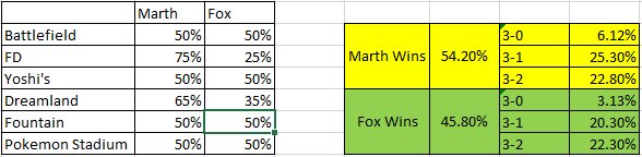 54.1% Marth 45.9% Fox (we're also assuming FD is only 55% here)