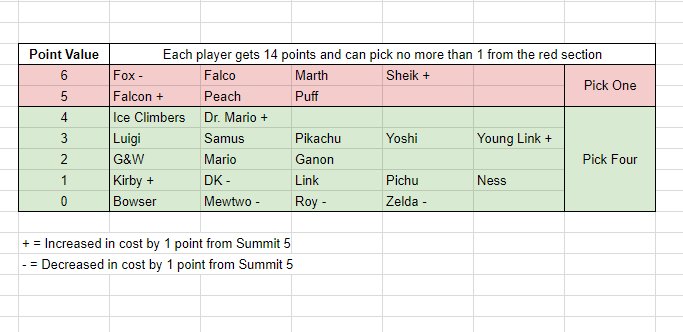 For reference, the two players that made the final last time were Axe and Plup. You got 15 pts last time. Their teams last time were Axe: Marth, ICs, Pika, YL, Kirby (15 then, 17 now) Plup: Sheik, Samus, Luigi, YL, G&W (15 then, 17 now) Everyone will have to edit their teams