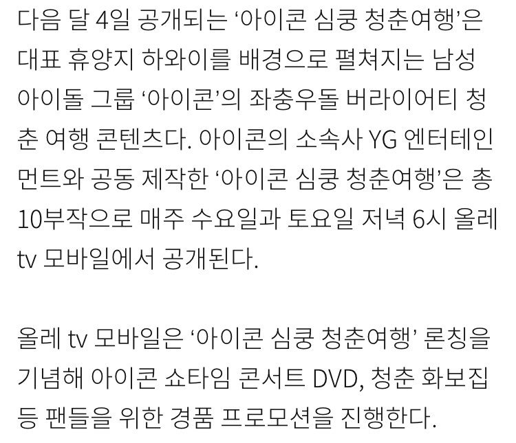 "iKON Heart Racing in Hawaii" will premiere on July 4.The content of the show is variety-like youthful trip of boygroup iKON in Hawaii. It is co-produced with iKON’s agency,YGE and will be on aired every Wednesday and Saturday at 6PM on Olleh TV Mobile,with a total of 10 episodespic.twitter.com/CxBJ5wtWBy