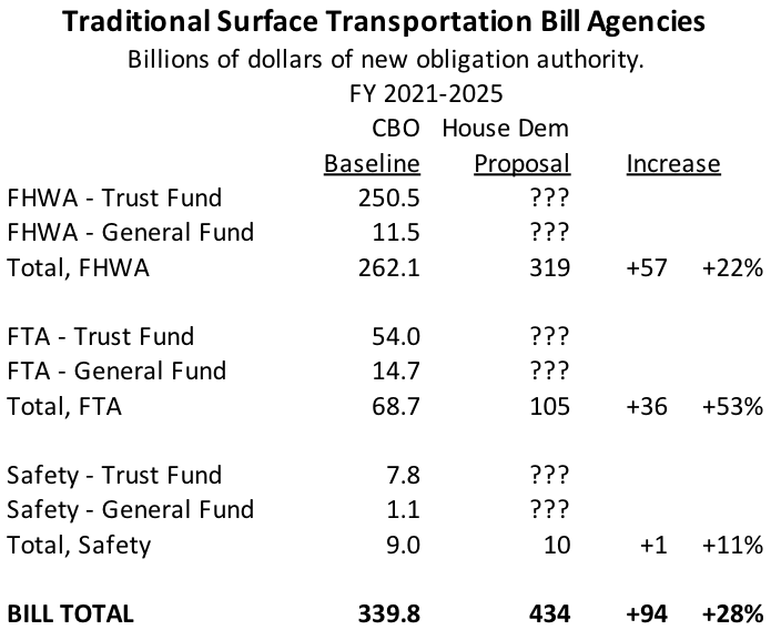 I finally got the full set of CBO baseline numbers and am updating earlier tweet. The House Dem proposal of a $434b surface transpo bill (excluding Amtrak/FRA) would be $94b above baseline, or 28% above.pic.twitter.com/j4sD1ZlNxT