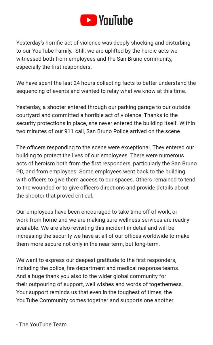 YouTube just posted this statement regarding the shooting, thanking first responders for their heroic acts and calling the officers exceptional. Employees have been encouraged to take time off of work and the company is increasing security "worldwide" and "long-term."pic.twitter.com/s8MMTftbp1
