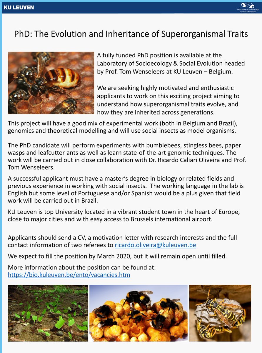 #bees,#wasps and#ants! Project features exciting mix of behavioural research,#genomics, theory & field work in Belgium and Brazil! For info check https://bio.kuleuven.be/ento/vacancies.htm …. Pls forward...pic.twitter.com/sWzkPRe7s9