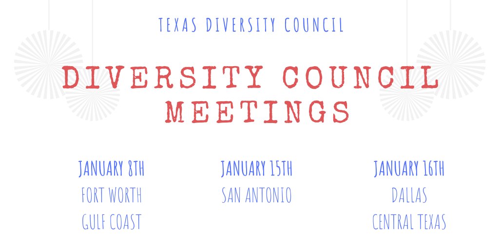 Our February Council Meeting is coming up. Join us in one of these great cities of Texas for a chance to discuss more about the value of diversity and inclusion by messaging your regional point of contact.pic.twitter.com/wKSZijAsl1