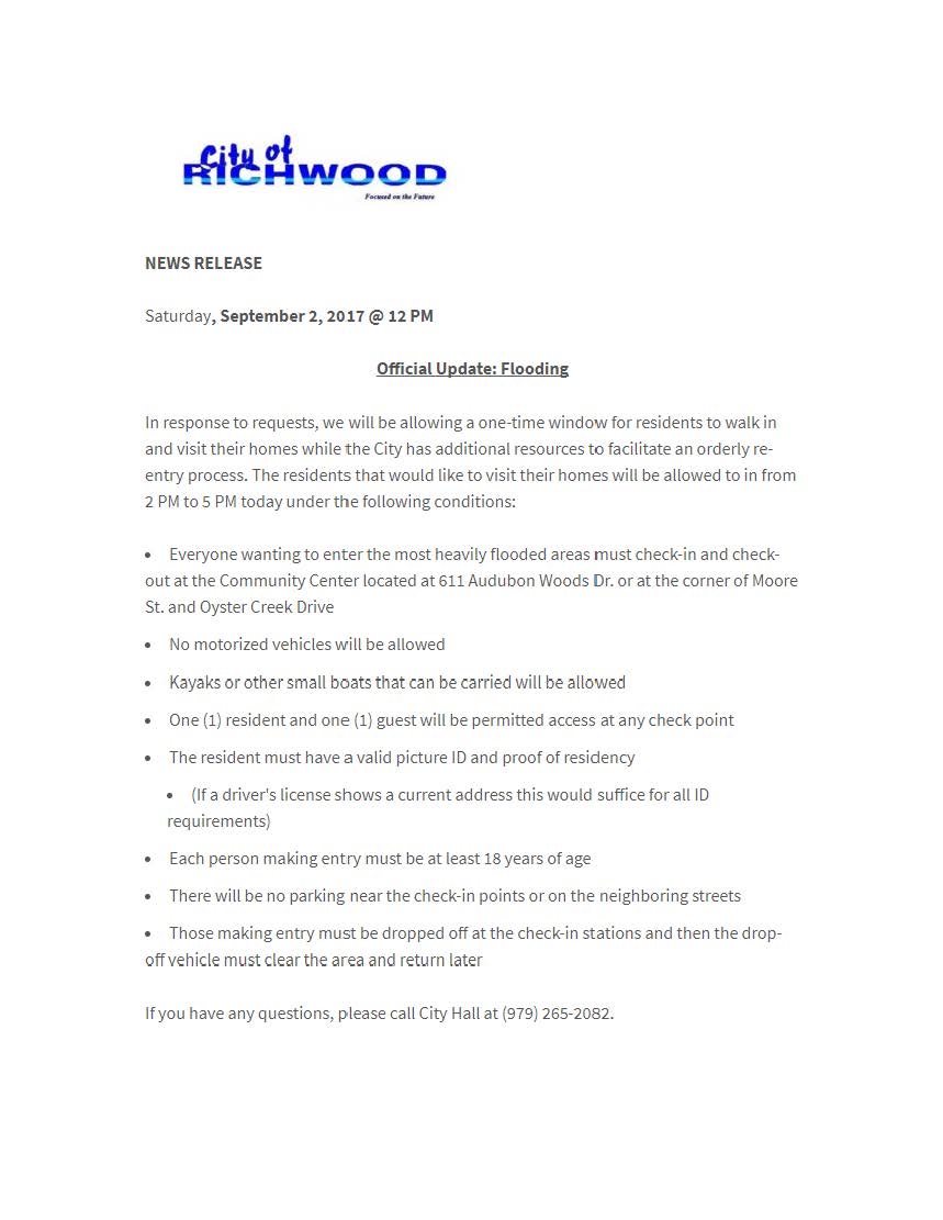 Richwood Residents - update on entering your homes, today 2 pm - 5pm.https://twitter.com/BrazoriaCounty/status/904053552124964865 …